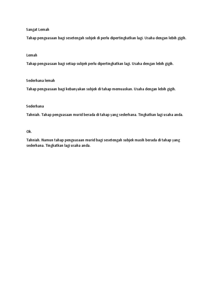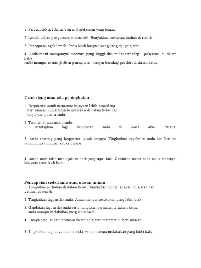 Ulasan cadangan yang boleh digunakan oleh guru-guru untuk buku pelaporan dan slip keputusan peperiksaan di sekolah. Jump to Page. 17 Mei 2016 Masa.